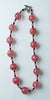 This Venetian glass centerpiece is reminiscent of the abstract artwork of Joan Miro. Vintage Swarovsky crystal of heliotrope along with new crystal of light siam, saphire, jet, and green serve as the pallete. A pewter toggle clasp of silver completes the design. 16 1/2 ” L