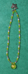 This necklace is destined to draw compliments with its bright green and yellow pendant against an alluring palette of clear, rose, peridot, and yellow Swarovsky crystal. A sterling silver toggle clasp with a hammered finish in the shape of a butterfly adds the final touch. 19”L