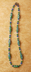 This sunny necklace contains lampwork beads with a ribbon of sky blue and opaque white daisies wrapped around a leafy green core, encapsulated in clear glass. Peridot, clear, and sapphire Swarovsky crystal compliment each bead. A sterling silver toggle closure in the shape of a heart adds the final touch. 18 1/2” L