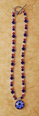 This necklace is destined to draw attention with its lampwork pendant containing a cobalt blue and opaque white star. Swarovsky crystal of fushia AB X2, clear, and cobalt accompany the centerpiece which is joined with a sterling silver toggle clasp in the shape of a heart. 19”L